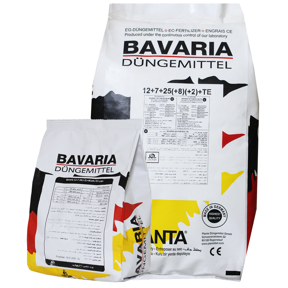 کود کامل 25-7-12 باواریا آلمان، کود NPK غنی شده با کلسیم و منیزیم و بههمراه عناصر ریزمغذی است، فرمولاسیون این کالا برای مرحله سایزگیری و رسیدگی میوه در محصولات با نیاز بالا به پتاسیم بسیار مؤثر است. حضور عناصر ریزمغذی در فرمولاسیون این کالا، سلامت گیاه و انجام عملکردهای بیولوژیکی اصلی نظیر لقاح، فتوسنتز و رشد مریستمی را برای گیاه تضمین مینماید.